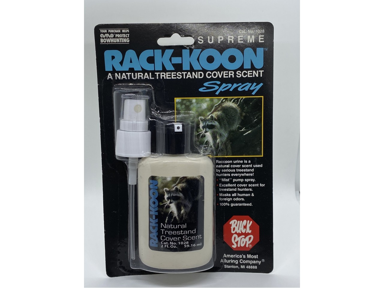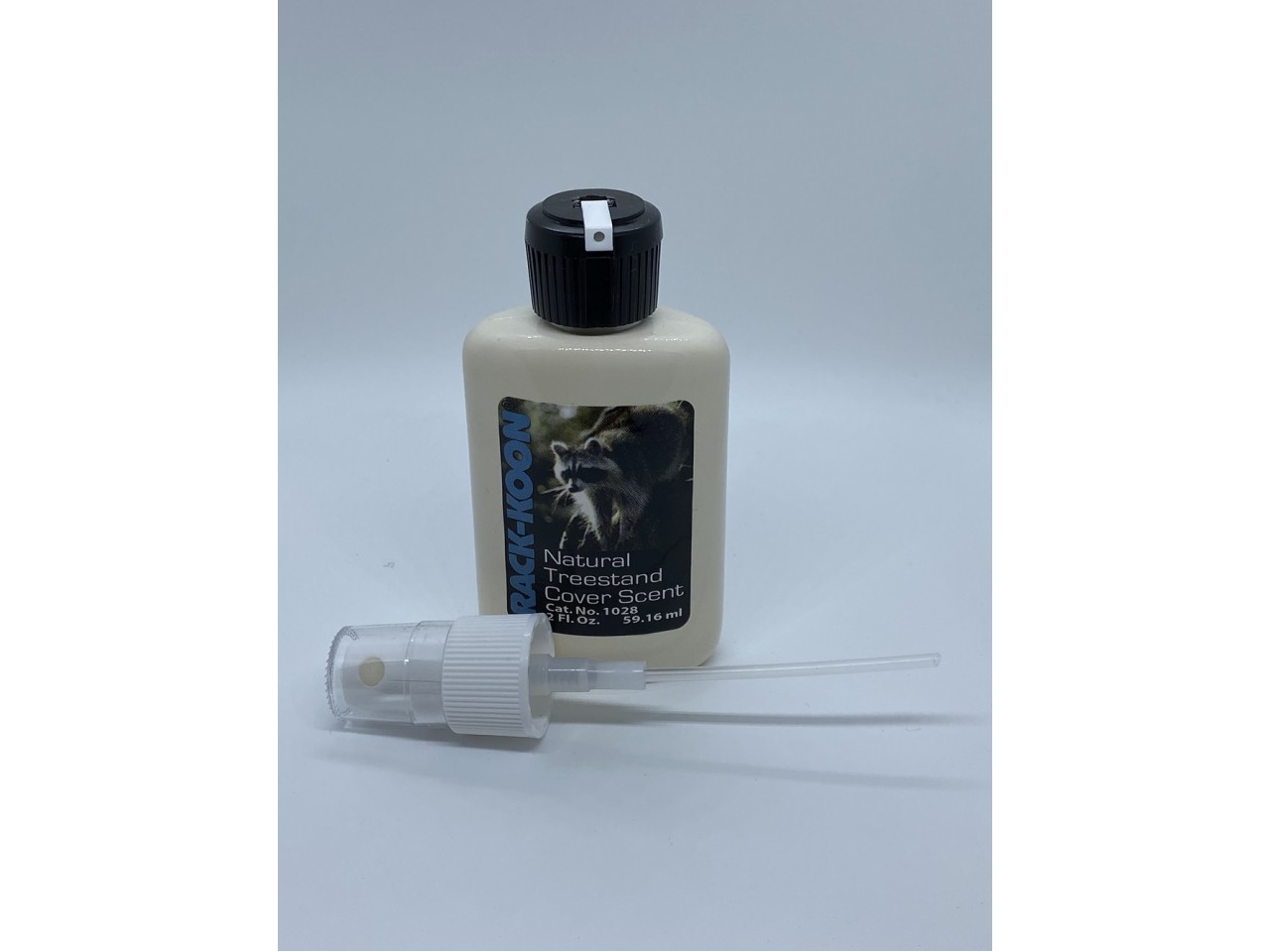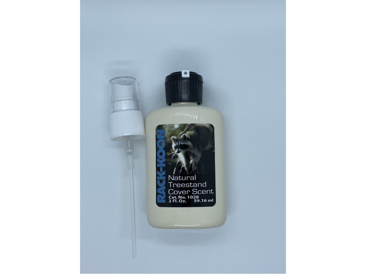 The perfect treestand cover scent. 2 oz. plastic bottle with spray pump mist applicator. Deer are less wary of movement and noise from tree stands when Rack-koon scent is use.