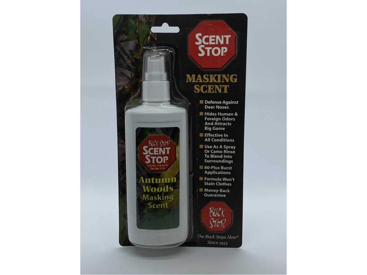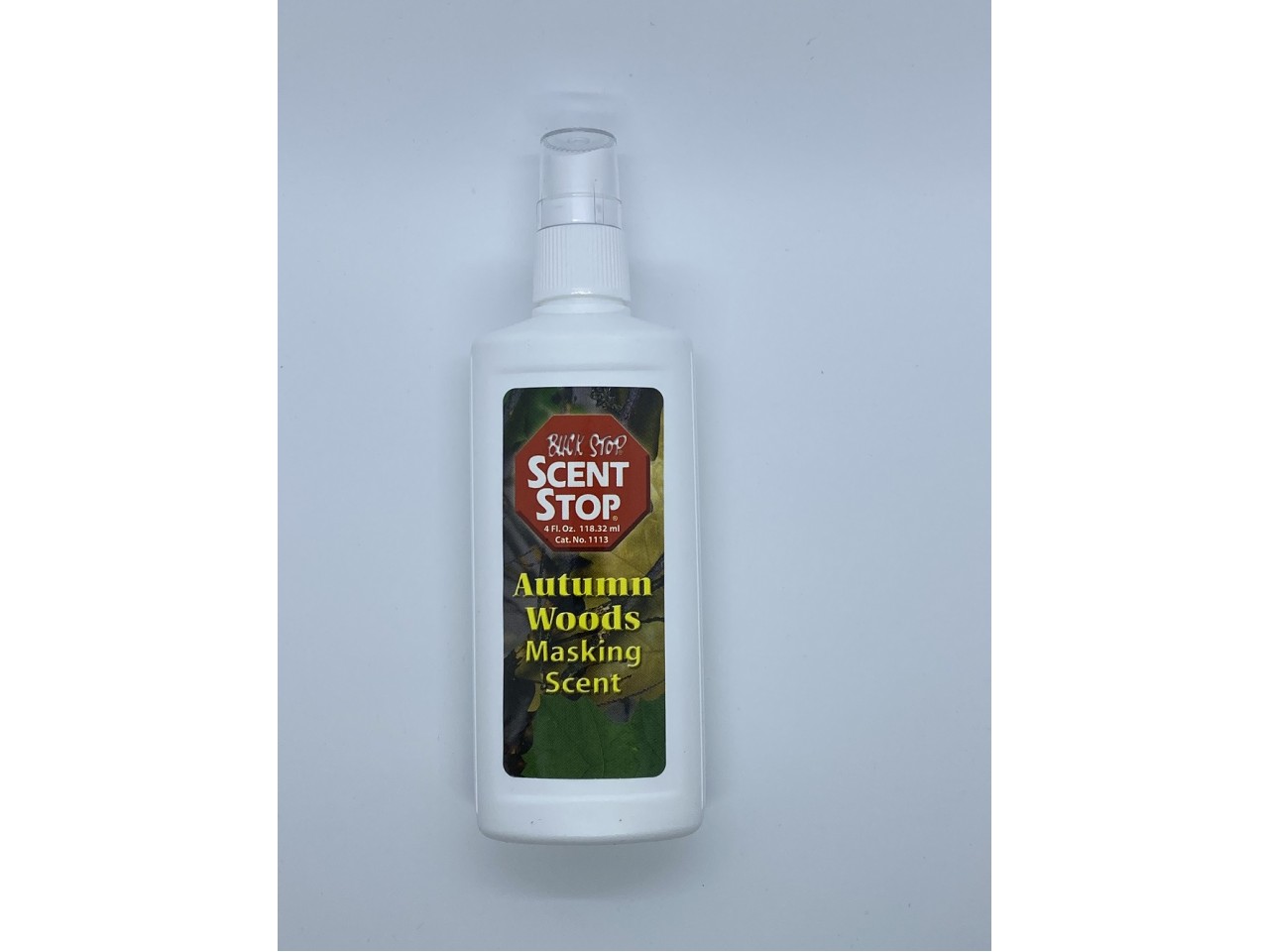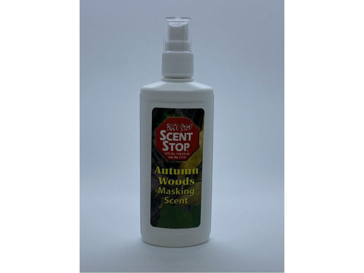 AUTUMN WOODS musky smell of fresh fallen leaves. 4 oz plastic bottle with spray pump applicator. Water based masking scent, safe to use on all clothing.