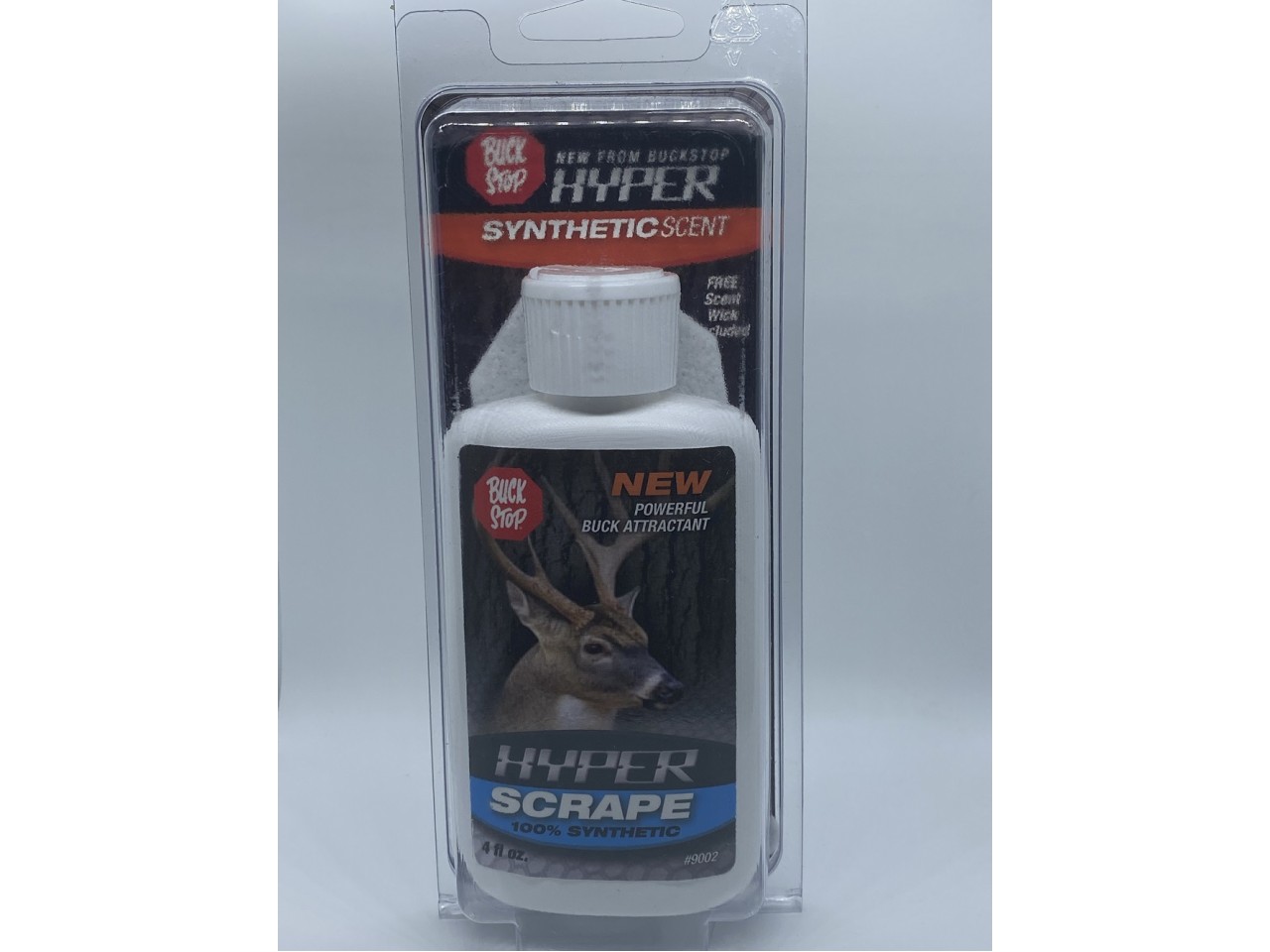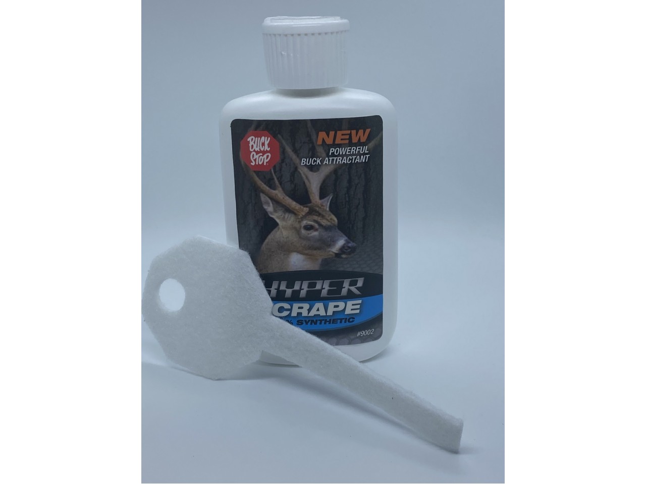 HYPER Synthetic Scrape Formula, 4 oz of powerful scent. Plastic bottle with flip top applicator. Brings deer in close. Free scent wick included